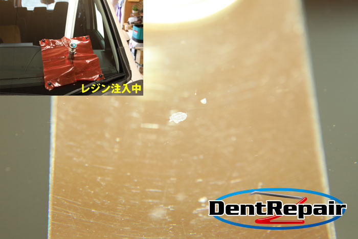 ひび内をしっかり真空してからレジン(ガラスリペア用特殊樹脂)の注入です。レジンが素直に入ってくれました。