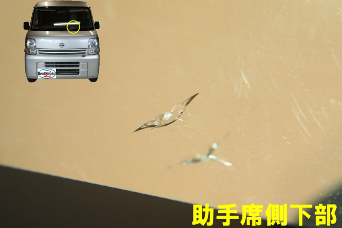 今日のガラスリペアのご紹介は、ニッサン・クリッパーの助手席側下部に出来たひび割れの修理です。