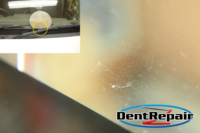 ひびにテープを貼っておいてくれたのでひび割れはキレイに状態でした。衝撃点部分を整えてからガラスリペア開始です。